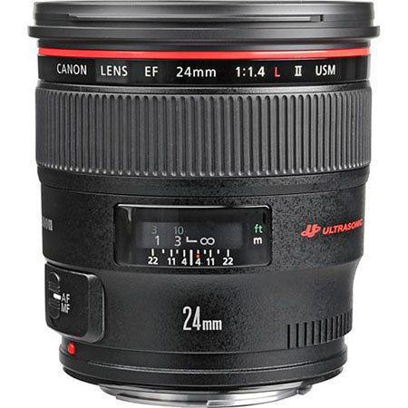 Canon's newest fixed length L-series lens, the EF 24mm f/1.4L II USM, incorporates the newest in Canon lens technology for spectacular sharpness and impressive performance at all settings. It features two high-precision, large-diameter aspherical lenses for sharpness across the sensor, even in peripheral areas of full-frame sensors. Lens elements have a newly-designed anti-reflective SWC (Sub Wavelength Coating) that departs from conventional coatings by using an extremely fine structure that minimizes ghosting and flaring across the lens surface, regardless of the angle with which light enters or exits. It also features two UD lens elements to minimize chromatic aberrations, incorporates rear-focusing, ultrasonic, quiet and high-speed AF with full-time manual override. A circular aperture provides beautiful out-of-focus detail and offers legendary dust- and water-resistant L-series construction using only lead-free glass.