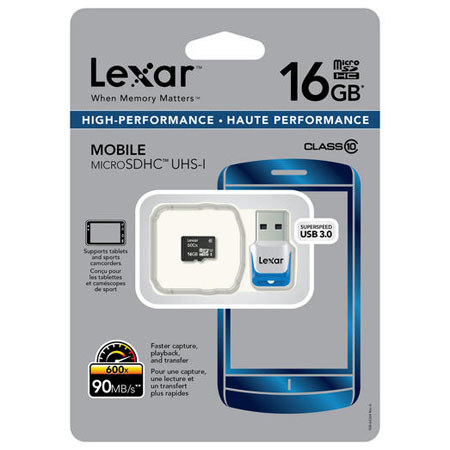 The Lexar 16GB High-Performance Micro SDHC 600x Class 10 UHS-I Memory Card features a maximum read speed of 90MB/s and a maximum write speed of 25MB/s, with minimum transfer rates of 10MB/s. It's compatible with devices that have microSDHC and microSDXC slots and can be used with full-size SDHC and SDXC slots via an optional microSD adapter. This Class 10 UHS-I card is supplied with a USB 3.0 card reader for high-speed file transfer to your computer.