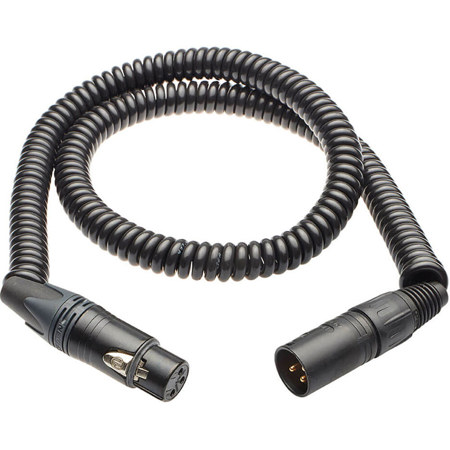 This coiled XLR cable features Neutrik male and female connectors for reliable, professional audio connections, with a stretchable design that extends up to 20 feet for flexible use. It incorporates advanced shielding via an aluminum Mylar helically wrapped foil with 25% overlap to minimize interference, paired with 28 AWG soft annealed tinned copper conductors (0.015" diameter) insulated by a 0.010" wall semi-rigid polyvinyl chloride layer rated for temperatures up to 105 Degree C. The durable outer jacket, made of 0.045" wall polyurethane with a 0.155" diameter, ensures flexibility, longevity, and resistance to wear in demanding environments.