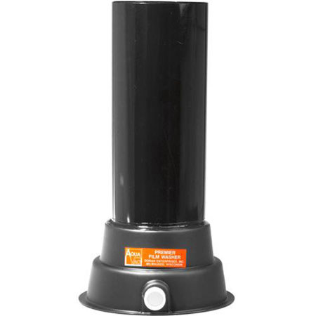 Complete washing of your film is as essential as proper development. This Film Washer will gently wash your negatives to archival standards. It differs greatly from conventional overflow washers which bring in water from the bottom and the contaminated water eventually overflows at the top. The AQUA/ VAC also fills from the bottom, but quickly and automatically empties from the bottom by vacuum syphon-action, which discharges all contaminated water 2-3 times a minute. The AQUA/VAC protects your film from abrasions caused by high turbulence and unwinding of the reel which is typical in conventional washers.