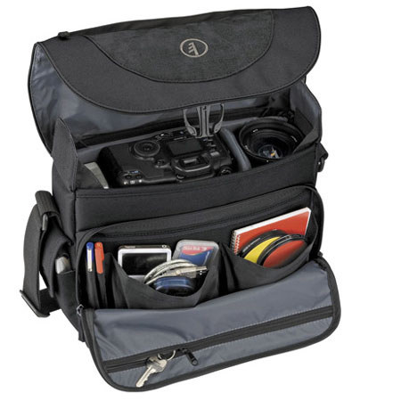 The stylish new Express 7 Camera Bag combines upscale, contemporary designs with the functionality that only a Tamrac camera bag provides. This sophisticated messenger bag delivers quick access and protection for a digital or film SLR with lens up to 6" long attached, additional lenses, a flash and accessories. The adjustable, foam-padded dividers protect and provide a custom fit to equipment. A front pocket, zippered Speed Pocket on flap and zippered pocket in back organize accessories, while a side pocket is perfect for a cell phone or MP3 player.