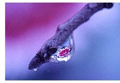 Specular spectacle: An image in a drop of water hanging from a branch makes a spectacular photograph, but finding the right drop in the right position with the right subject to be imaged in it can sometimes be a frustrating experience. Good for you if you do find them. Otherwise, cheat a little bit like I did, and bring a small branch indoors. Prop it up on some sort of support, such as a hunk of florist’s clay or modeling clay. Then position the subject you want to be reflected in the drop.