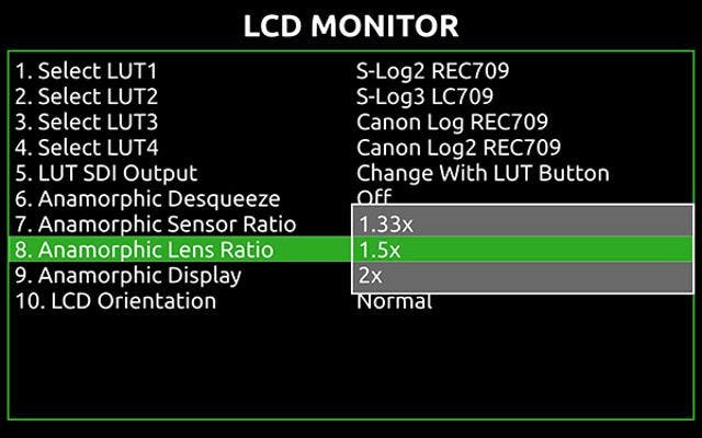 • Expanded Anamorphic Desqueeze feature plus menu options for Sensor Ratio, Lens Ratio and Display format.