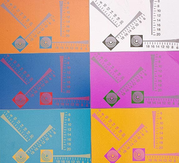 Test target: I shot a resolution test target placed parallel to the film plane at a distance of approximately 6-1/2 feet to assess overall image quality and fine detail rendition. The target includes subtractive color arrays that can theoretically provide figures for system resolution in various colors, but I did not attempt to quantify the results since it was evident that the resolution capability of the film itself far exceeded that of the lens, which resolves about 64 line-pairs per millimeter in the center of the field and about 40-50 line pairs per millimeter in the corners at the optimum aperture of f/8 based on previous tests shooting USAF test targets on Kodak Tech Pan.