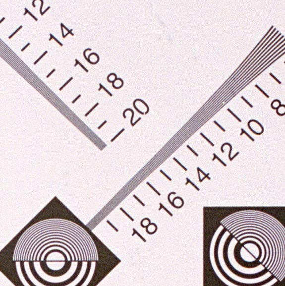 Speaking of detail, it is possible to count lines down to about number 16 on the diminishing linear array on the resolution test target image, but the inability to resolve even finer detail is due to the limitations of the lens, not the film—if you doubt this, check out the MTF chart in the Kodak Tech Data sheet.
