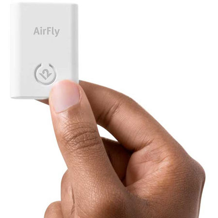 Wish you could listen to in-flight TV with your AirPods Want to hear the gym cardio machine's TV audio with your wireless headphones Now you can, thanks to AirFly - a tiny device that connects wireless headphones to wired-audio jacks on planes, in fitness centers and anywhere else wired headphones were previously required. Just pair your wireless headphones with AirFly, plug it into the headphone jack and you're ready. It's just that easy! AirFly stays charged for eight hours and includes a USB charging cable and travel pouch.