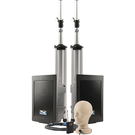 The Explorer Deluxe Package (EXP-DP) comes with a portable sound system that is small, lightweight and easy to transport. It includes the EXP-8000U1 speaker which comes with one built-in 16 channel wireless receiver and your choice of wireless microphone. It also comes with the EXP-8001 companion speaker, a connection cable and two speaker stands. It operates 6-8 hours on a single charge. There is a charging LED bar indicator and two universal microphone jack inputs on the back. It also has a "Voice Over" music ducking feature. Use it at schools, sporting events, corporate events, places of worship and more!