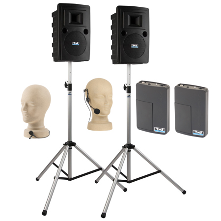 The Anchor Audio LIB-DP2-AIR Liberty Deluxe AIR Package 2 is a package that includes (LIB2-XU2) Liberty with built-in Bluetooth, AIR wireless transmitter and dual wireless mic receiver, (LIB2-AIR) Liberty AIR wireless companion speaker, two (SS-550) heavy duty stand and choice of two wireless handheld mic or headband and lapel mic with belt pack.