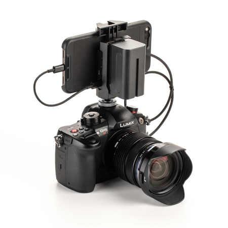 The M1 Cable also comes with a phone cradle for easy mounting via your camera's hot shot mounting point. This cradle has an NP-F battery port which allows both powering of your smartphone via the USB-C port and the camera it's feeding video to by DC power outputs. Never run out of battery while capturing video again! The cradle also has a cold shoe adapter for mounting a light or microphone on top of the M1 cradle.