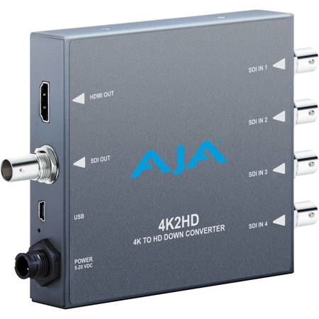 The AJA's 4K2HD down-converts professional SDI 4K/UHD signals to HD resolution using AJA's high-quality scaling for cost-effective monitoring and conversion. 4K2HD's HD-SDI and HDMI outputs are both live all the time, producing fantastic-looking HD images for on set monitoring or direct-to-air broadcast. 4K2HD outputs SDI and HDMI simultaneously. 4K2HD supports high frame rate (HFR) 4K inputs at 50 and 60fps and gets converted to HD outputs at 50 and 60fps for accurate viewing. 4K2HD's configuration options can extract an HD resolution image from the 4K input to provide a one-to-one pixel image for 4K focus checks on HD displays. Configuration can be set remotely via AJA MiniConfig software control over USB.