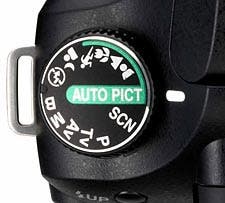 > Easy being green: Many digital SLRS offer an exposure option that’s commonly called “Green Mode” and is indicated by a green arrow or in this Pentax K200D is called “Auto Pict” which essentially turns your digital SLR into a point-and-shoot camera. Not all of the shutter speed and aperture choices this exposure mode are what an experienced shooter might choose but it’s designed to produce sharp, well-exposed photographs.