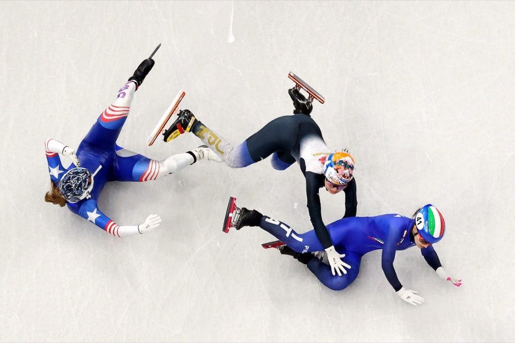 A shirtless gold medalist roaring in triumph. A quiet moment of an Alpine skier kissing her gold medal. A short track speed skating crash, ice spraying, faces contorted, bodies tangled, captured with cinematic intensity.