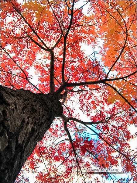 - Change your perspective! Yes, you can bend down and shoot colorful leaves on the ground, but try getting on the ground and shooting upward. A tree full of colorful leaves plus a blue sky (and possibly white, puffy clouds!) can yield a beautiful colorful abstract photograph too.