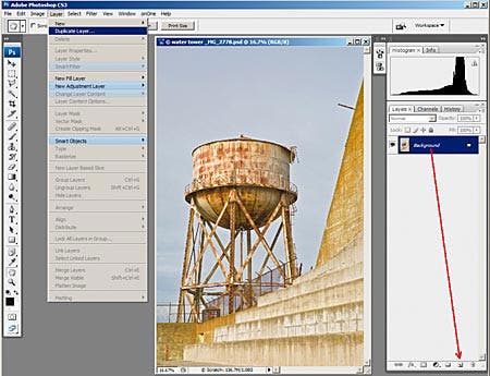 A lot of people think layers are too complicated, but if you can make a pastrami sandwich, you can work with layers. And you should, because they are one of the most powerful features of Photoshop. I’ll show you some of the magic using images I shot recently on Alcatraz.I gave a brief introduction to layers in my tip Layers: The Basics in the 100 in 100 feature, Day 56. Now we’re going to look at layers in depth.I’m using Adobe Photoshop CS3 but most image editing programs support layers. Of course, menus will be different in different programs and versions. And I’m speaking Windows; if you use a Mac substitute Command for Ctrl, Option for Alt and Control-click for right click.Two kinds of layersThere are two kinds of layers: pixel layers and adjustment layers. Adjustment layers let you make changes to the appearance of an image without actually altering its pixels. This both preserves your original image and lets you modify the effects later without causing degradation of the image. Pixel layers (which are usually simply called layers) let you make alterations to actual image information on a separate layer, preserving your original image, and allow you to combine elements from different images.Open the Layers PaletteTo work with layers, you need the Layers palette visible. If it isn’t, go to the menu bar and click Window > Layers, as shown in the figure below. As you can see there, I like to group the Layers palette with Channels and History and close the ones I rarely use, leaving the Histogram and Info palettes open. Closed palettes can always be re-opened from the Windows menu. Every image starts as a Background layer, which you see in the Layers palette above. This is a pixel layer; it contains image information. Adjustment layers, which you can see in the figure below, sit on top of pixel layers and alter things like colors and tonalities non-destructively. In addition to several adjustment layers, you can have several pixel layers in an image, by duplicating an existing layer, by creating a blank layer to paint or clone onto, or by importing elements from another image. I’ll show you how to create these layers below. Each layer affects those below it as though you are looking down through the stack from the top. A pixel layer in the default Normal mode blocks whatever is below it. Visualize a print laid on top of another print. Some of the prints could have transparent cutout areas that let the layers below show through. An adjustment layer is like looking down at those prints through a filter on steroids.Each additional full-sized pixel layer increases the file size by the number of megabytes in the original Background-only image. Adjustment layers cause only a small increase.Many things you do with layers can be done from one of three menus: the Layers menu (on the menu bar at the top of the screen), the flyout menu you get by clicking on the icon in the upper right of the layers palette (circled in red in the figure above) or by right-clicking on the layer to bring up a context-sensitive menu. (The three choices don’t all give the same options.) Many operations can also be carried out by graphical methods such as dragging and dropping, as you will see below. You control which layer you are working on by clicking it in the Layers palette. This makes it active (highlighted in blue.) You can rename any layer by clicking on its name in the Layers palette and typing a new name. But don’t rename the Background unless you know what you are doing as that changes some of its properties.You can turn the visibility of a layer on and off with its eyeball thumbnail. If a layer (of either kind) is turned off it won’t have any effect on the image. It is as though it isn’t there. This provides a way to have several versions of an image in the same master file. You can reduce the opacity of a pixel or adjustment layer with the slider in the upper right of the Layers palette.You can change the order of a layer in the stack by simply dragging it up or down. You can delete a layer by dragging it to the trash bin in the lower right of the Layers palette, or from the menus. You can use the Move Tool to move pixel layers horizontally and vertically and you can resize them under the Edit > Transform menu.You can merge layers. Even though I advocate keeping the layer structure preserved as much as possible, sometimes it is desirable to merge two or more layers. Highlight the layers by clicking on the first one and Ctrl-clicking on the others. Then go to the menus and choose Merge Layers. You can also turn off the visibility of all layers except the desired ones and choose Merge Visible.You can cause a pixel layer to blend with one below it in some very interesting ways, using the blending mode choices in the dropdown window in the top left of the Layers palette, just left of the Opacity slider. I’ll show an example below.I will discuss pixel layers in this tutorial and adjustment layers in a subsequent one next month. The adjustment layers in the figure above are dummies put in to show what they look like. (I left their settings at the initial null values.) For simplicity I chose an image that could get by without adjustment layers and I have deleted them for the rest of this tutorial. But virtually all the images I work up do benefit from adjustment layers. (Stay tuned for Part 2.)Create additional pixel layersYou create another pixel layer when you duplicate the Background or any other pixel layer. (One reason for doing this would be to have a before and after version when you are going to do significant cloning or a Shadow-Highlight adjustment.) You can duplicate the Background several ways. You can drag the layer to the “Create a new layer” icon at the bottom of the Layers palette, the one that looks like a piece of paper next to the trash can. Or you can do Ctrl-C and then Ctrl-V, or Ctrl-J will do it in one step. You can create a new, empty pixel layer from the Layers m