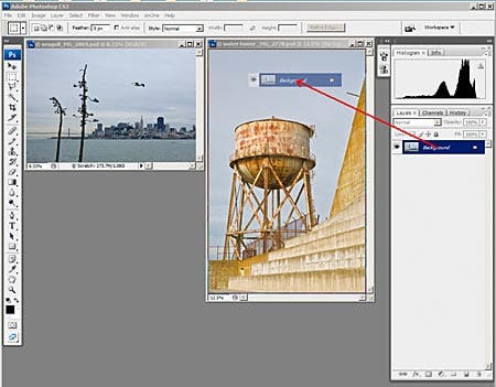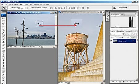 Alternatively you can also copy and paste a layer between images. Go to the source image, make sure the proper layer is active and do Ctrl-C, then go to the destination image and do Ctrl-V. You can’t use Ctrl-J to copy between two images.In the case of importing the bird I don’t need to drag the entire layer. I can make a rough selection, choose the Move Tool, click inside the selection and drag it into the working image, or do Ctrl-C / Ctrl-V as above. I can then erase the extra sky in the copied selection with a mask, as I will show below.