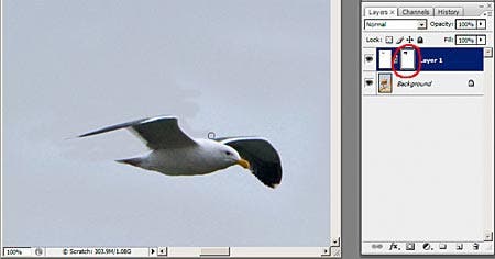 Masking a pixel layerNow I need to mask out the extra sky around the bird, which doesn’t match the sky in the destination image. Masking is simply non-destructive erasing and is very simple. I make sure the bird layer is active and create a mask by clicking the Add Layer Mask icon at the bottom of the Layers palette, the one that shows a circle inside a rectangle, and a mask thumbnail appears on the layer. I can also create a mask from the Layers menu, but not from the menu I get by right-clicking. Making the mask from the menu gives the option to reveal all (the mask will be all white) or hide all (the mask will be all black.) Think of the mask as a stencil where the white areas are cutouts you can see through and the black areas are solid paper you can’t see through. I prefer to begin with a white mask and paint with black to hide the areas I don’t want. The mantra of the mask is: black conceals and white reveals.I could have made a “hide-all” mask (one that is initially black) by Alt-clicking the Add Layer Mask icon instead of just clicking it.