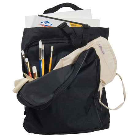 A rugged, yet versatile, water-resistant black nylon bag with zippered top. Main compartment holds items up to 17"h X 14"w x 3½"d. Large capacity zippered front pocket holds contents up to 12" x 13". Rear pocket with Velcro fastener holds items up to 6" x 6". Inner pocket holds additional supplies. Extra long carry handles conveniently fit over the shoulder.