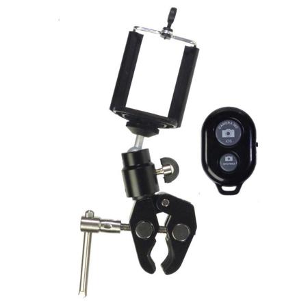 This smartphone mount kit lets you attach your cell phone to a round or flat surface at any angle, providing support for stable picture taking. The included Bluetooth Wireless shutter release pairs with all iPhone 4, 5, 6 and 7 and most Android phones since 2010; some Android phones may require an additional APP from Google Play. The wireless shutter assures ultra sharp photos; includes a detailed American-written user manual. The Smartphone Spring Grip Mount allows for phones up to 3 inches wide.