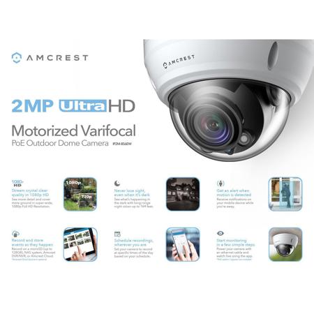 The Amcrest ProHD 2MP PoE dome video camera helps you stay in touch with what you love anytime, anywhere. With its quick mobile setup process, you will have secure access to your camera's video stream in no time. Stream live and playback recorded video of your home, your kids, your pets, or your business on the go with the Amcrest View app. Amcrest Cloud offers optional cloud recording with free live viewing and 4 hours of free video storage accessible from any device including Apple Mac, Windows PC, iPhone, iPad or Android devices. Amcrest cameras also record and upload to an FTP as well as record to any Amcrest (or ONVIF compliant) Network Video Recorder (NVR) (not included).