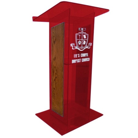 The wood side panels of the lectern are made from red oak and are available in three different color options: Medium Oak, Walnut, or Mahogany.