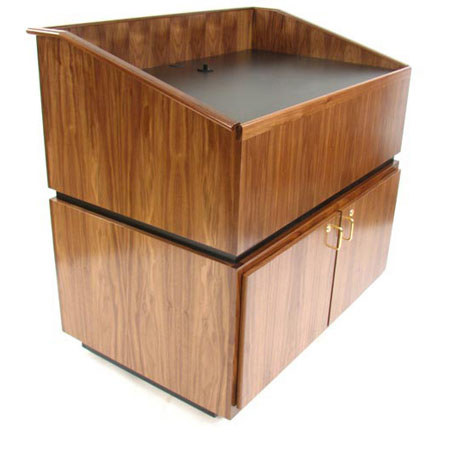 This freestanding lectern boasts an extra-large reading surface, providing ample space for your notes or laptop. It also features expansive storage areas, complete with locking doors for secure storage of your multimedia equipment and presentation materials.