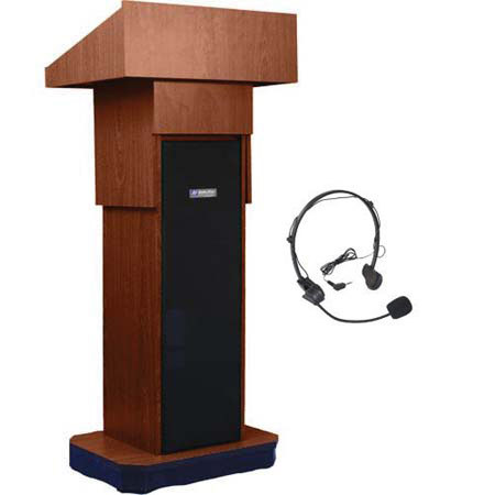 The SW505A has elegant, stylish high pressure Walnut laminate finish. It also features 2 built-in Jensen designed speakers. The lectern has a transmitter and wireless headset mic and professional cardioid dynamic mic with 15' cord, flexible gooseneck and shockmount mic holder. The also lectern has 4 casters (2 lock).