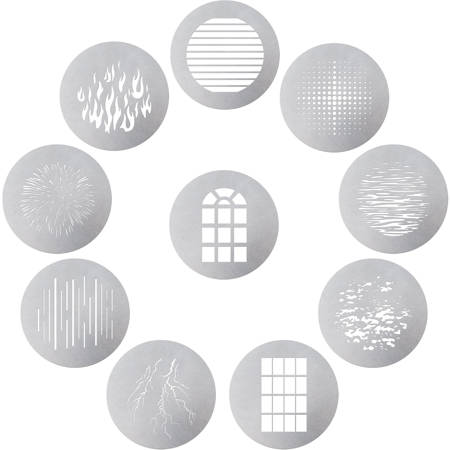 The versatility of this kit is unparalleled, providing a broad spectrum of patterns that can be effortlessly interchanged to produce dynamic and visually captivating lighting effects. Whether your goal is to emulate natural phenomena with the "Lightning" or "Ripple" GOBOs, or to achieve a more structured aesthetic with "Modern Window" or "Grille," the creative possibilities are virtually limitless. These B-Size GOBOs are constructed with high-quality materials that ensure sharp, precise projections, delivering a professional finish to any scene.