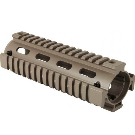 The AIM Sports Carbine Length Handguard Quad Rail for M4 comes with a two piece "drop in" design and is for most carbine length direct impingement gas systems. This Handguard Quad Rail is constructed of anodized aircraft grade aluminum and accepts all standard Weaver / Picatinny 1913 accessories. This Handguard Quad Rail includes rubber rail covers and best of all, gunsmithing is not required.
