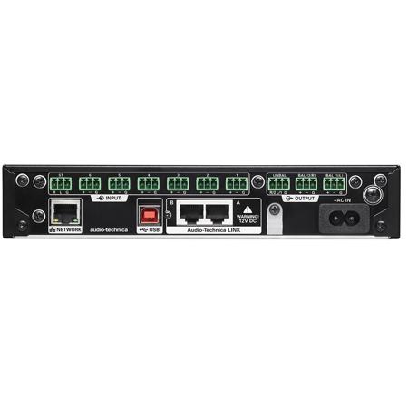 The mixer is equipped with four balanced microphone inputs, two balanced Mic/Line inputs and one unbalanced stereo input, along with two balanced and two unbalanced outputs. Network (Cat5e or better) and USB ports are also included, as are A/B Audio-Technica Link ports that let users connect six ATDM-0604 mixers via Cat5e cable for simultaneous use within an expanded setup.