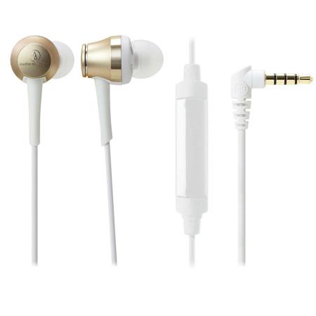 The ATH-CKR70is headphones are equipped with an in-line controller and microphone to let you easily answer calls and control music and video playback. Four sizes (XS, S, M, L) of interchangeable eartips are included to provide a customized fit and improve sound isolation. Available in black (ATH-CKR70iSBK) and champagne gold (ATH-CKR70iSCG).