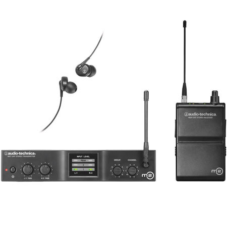 The Audio-Technica M2M Wireless In-Ear Monitor System is designed to make professional in-ear monitoring features accessible for performers who want to be free from the problems associated with floor wedges. The stereo monitor system offers Personal Mix Control, which gives each musician volume and mix control of two independent signals on stage, via easy-to-use controls on the M2R stereo body-pack receiver.