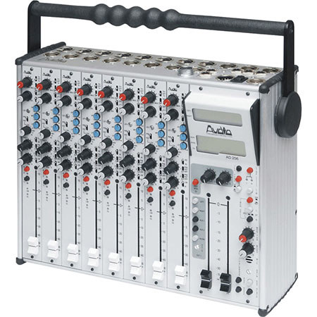 The Audio Developments AD256 8 Inputs/2 Outputs Film Location Mixer is another addition to the Audio Developments Ltd range of portable mixers, having comprehensive facilities set out in an ergonomically friendly design and all contained within a robust and rugged aluminum case with a relatively small footprint. The features and specification are based on the well established AD255 Mixer. Input channel limiter, continuously variable HPF and mute switch are the main additions. As with the other models within the range, professional components are used throughout including Penny and Giles 100mm, long-stroke, conductive plastics faders. Location sound professionals now require multi-track record facilities; the channel direct outputs provide the necessary features. By use of an additional switch these outputs can source other signals if the direct signal is not required, (Main Output and Auxiliaries). The 2 LCD meters are useful for monitoring level at a direct output. Battery level and monitor status (Direct or Return) are also indicated. Back-light illumination is also included. The Monitor selection allows left, right, left/right, auxiliary 1, auxiliary 2, auxiliary 1 + 2 and returns to be routed to the headphone output. An M-S matrix amplifier can be inserted to main or auxiliary outputs in the M-S domain.