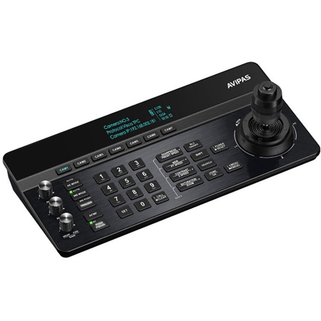 AViPAS AV-3207 is a PTZ camera joystick controller for any camera supports VISCA, PELCO D/P, VISCA over IP, UDP, TCP and ONVIF protocols. Supports control over IP(RJ45) and via RS232/RS485/RS422 Serial communications. With joystick/buttons/Knobs combination, it allows operator easily to control pan, tilt, zoom and focus of the camera, and in addition to control the settings of camera, such as iris, red & blue gains, white balance, image color adjustments, presets, P/T/Z speed and many other ways to operate your camera. It has 7 quick camera selection buttons that makes it easily to switch and control between 7 cameras, this fits the most applications. The 3.12" large OLED screen with backlit, is convenience to see the current settings and do configurations in any lighting conditions. This controller can control up to 255 cameras.
