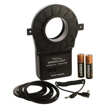 The Alzo Sparks Light is a ring flash light for gemstone and jewelry photography. The Sparks Light breaks up the light into many beams, which brings out the brilliance of gemstones. There is no other light source that produces the dramatic effects of the Alzo Sparks Light. The Alzo Sparks Light is a patented, accent specialty light source and is normally used with main or ambient lighting. The Sparks Light comes with 3 lens adaptors, a sync cord with PC connector and 2 AA Duracell batteries.
