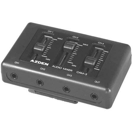 This minature 3-channel microphone mixer allows you to add and mix sound from 3 microphone sources simultaneously. Only 3 1/4" x 1/4" x 2 1/8", it weighs 3 ounces, uses no batteries, and can be attached to the camcorder or the handstrap.