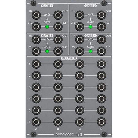 The Behringer System 100 173 Quad Gate/Multiples module features four signal gates with buffered audio inputs and outputs, six-channel multiples with four floating parallel connectors, and the option for control gate operation, non-inverting (active high) input, or inverting (active low) input. It's designed to fit into a standard Eurorack case.