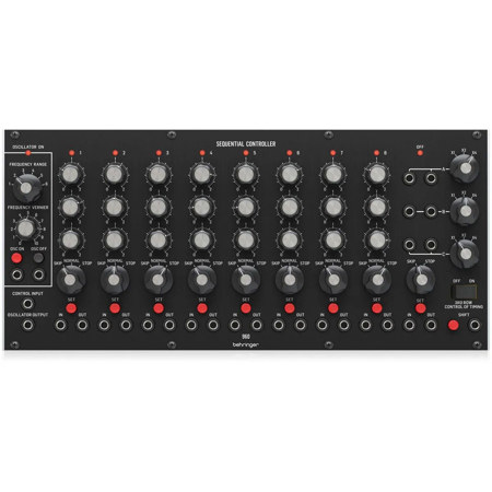 The 960 SEQUENCER CONTROLLER is an 8-step sequencer with 3 rows of CV controls for adjusting the pitch of a signal at that stage. An additional 9th step can be used to stop the sequence. Plug in a Behringer 962 SEQUENTIAL SWITCH and transform the 960 from an 8-step sequencer into a 24-step giant capable of creating more intricate sequences and beats.