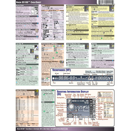 This is a one-of-a-kind CheatSheet for the Nikon D5100 Digital SLR camera. If you own this camera, you know what an amazing device it is. But who can remember all of those functions??