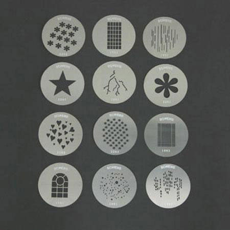 This is a set of twelve different patterned gobos for use with Bowens M-Size gobo holder BW-1880.