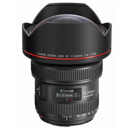 To experience the ultimate in wide-angle photography, the Canon EF 11-24mm f/4L USM brings L-series construction and optics to the widest zoom lens Canon has ever made. With an expansive wide-angle range of 11-24mm, this is an ideal lens for landscapes, interior shots and unique perspectives on subjects close and far. Its new optical design features Super UD and UD lenses that correct chromatic aberration. Four aspheric lens elements help to minimize distortion from the center of the image to the periphery and throughout the zoom range. A Sub wavelength Coating (SWC) and Air Sphere Coating (ASC) significantly reduce flare and ghosting, while a 9-blade circular aperture diaphragm creates beautiful, blurred backgrounds. For silent and fast AF, it features a rear focus system and ring USM and can be manually focused even when in AF mode. It has a minimum focusing distance of 11 in./0.28m (extreme telephoto) for admirable performance and results even when shooting in tight spaces.