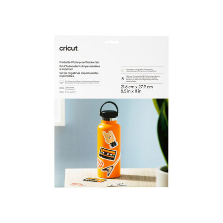 Make a statement with custom, full-color waterproof stickers that shine. These stickers are durable and UV resistant up to 2 years, with a holographic effect - perfect for tumblers, car bumpers, outdoor signs & so much more. Each set includes a sheet of Printable Vinyl and Vinyl Laminate. Use the Printable Vinyl to print full-color sticker designs with your home inkjet printer. Burnish the Vinyl Laminate over your design, then precision-cut your stickers with a compatible Cricut cutting machine. For best results, remove printer paper from printer tray. Then, load and print only one sheet of printable vinyl at a time.