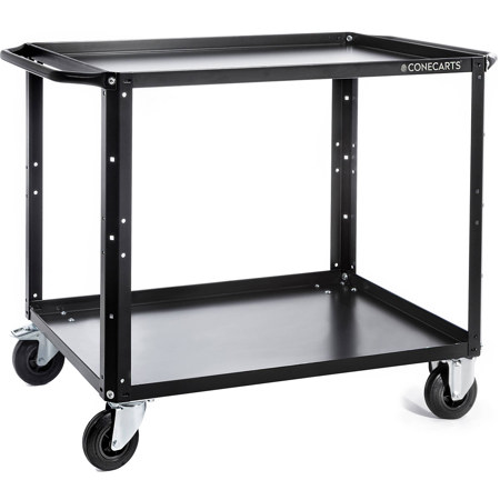 Two-shelf cart completely in black steel (RAL 9005). Small version. The cart has two large side handles that can also be used as hanging points. Large wheels, 125 mm in diameter, for ease of transportation on all surfaces. The wheels are as follows: 1 swivel wheel with brake, 1 swivel wheel without brake and two fixed wheels. Lightness and strength are combined with easy and intuitive assembly.