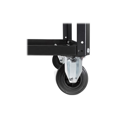 Fixed wheel with pressed steel sheet support and plate fitting and dust cover, swiveling on double ball bearing.