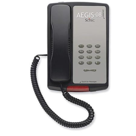 Scitec brand Aegis-08 Series economy hotel phones are known and valued by hoteliers worldwide for their rugged, trouble-free performance. Single and two-line speaker and non-speakerphone models are available with options for 0, 3, 5 or 10 programmable guest service keys and patented OneTouch message retrieval designed to keep your guest connected with a single touch of the lightbar. (This model has Single-Line Non-Speakerphones)