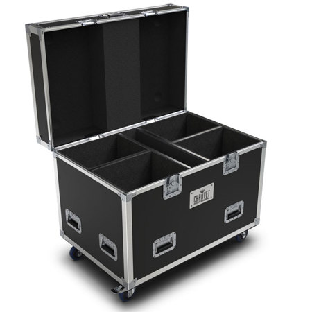 Chauvet Professional ROGUE R3 WASH QUAD fixture road case is a sturdy case. It contains a cable slot, 1/2 inch plywood, recessed handles, large latches, zip clamps, lid holders, black abs paneling, flat corners foam, carpet and aluminum trim all around the case with 1/2 inch double angles.