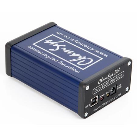 In its most common application, MagicQ Two Universe DMX Interface performs just as the name implies, it provides two DMX universes to MagicQ PC, MagicQ Mac and MagicQ consoles. Connection is via USB and provides two independent DMX512 and electrically isolated outputs, protecting against damage to your PC. The outputs can be patched to any of the 64 Universes available in the MagicQ software, so building a medium sized system out of several copies of this device is a viable strategy.