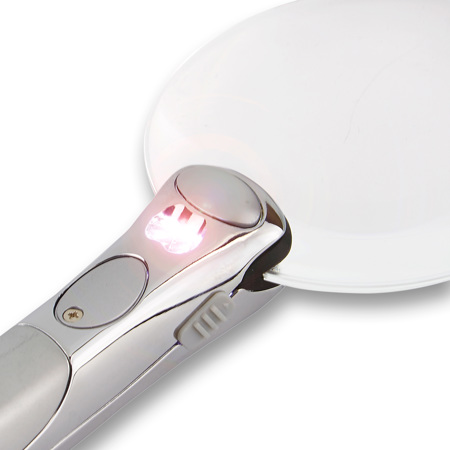 The Carson 2x Chrome Lighted RimFree Magnifier is actually a 2x power "designer" magnifier with built-in LED illumination and an ergonomically designed handle for the ultimate in comfort and viewing convenience. Its rim-less crystal-clear acrylic lens gives you a sharp distortion-free view. Bright white LED illumination allows viewing in the dark. The soft pouch protects the lens when not in use.