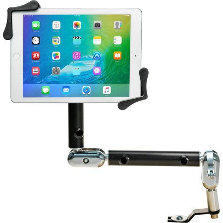This flexible, multi-jointed tablet mount allows you to comfortably and safely display your tablet in the front seat of your car. Designed for use with commercial and passenger vehicles alike, this drill-free car mount installs easily to your vehicle's seat rail using included mounting hardware and can be safely removed at any time. The arm features two tilting, rotating joints for custom positioning, plus folding clasps to lock them in place, preventing unwanted movement when in motion. The slide-adjustable tablet holder also tilts and rotates 360 degrees for portrait and landscape orientations, protecting your tablet from theft with a powerful lock and key security system. Its unique corner-grip design prevents tablet removal when locked and allows full access to your tablet's ports, buttons, cameras, and headphone jack, for card reader compatibility. The arm mount is also equipped with an interior cable management system to permit neat tablet charging while in use.