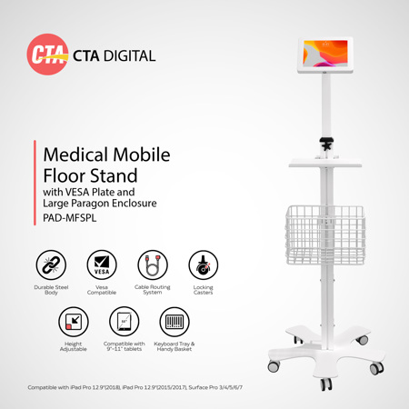 Whether it's for patient check-ins, interactive displays, or mobile point-of-sale systems, the CTA Digital Medical Floor Stand with VESA Plate and Large Paragon Enclosure is a reliable and sophisticated choice, backed by the reputation of CTA Digital for producing high-quality products that stand the test of time.