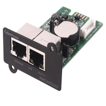 The CyberPower RMCARD203 Remote Management Card with Optional Environmental Sensor is a full-featured network UPS management device that remotely manages, monitors and controls CyberPower UPS products. The internal card allows remote monitoring and control of a UPS via Web Browser or NMS connection. By utilizing the auto-shutdown software, servers and workstations stay protected from data loss due to power failure.